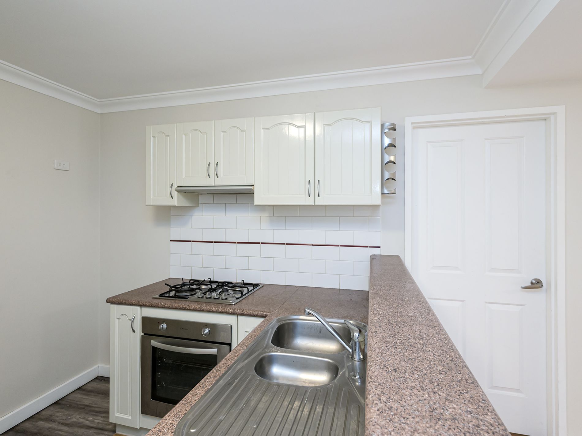 The modern kitchen is well-appointed with stainless-steel appliances, including a gas cooktop, under-bench oven, rangehood, double sinks and stylish subway-tile splashbacks.
